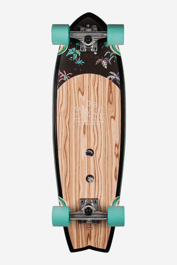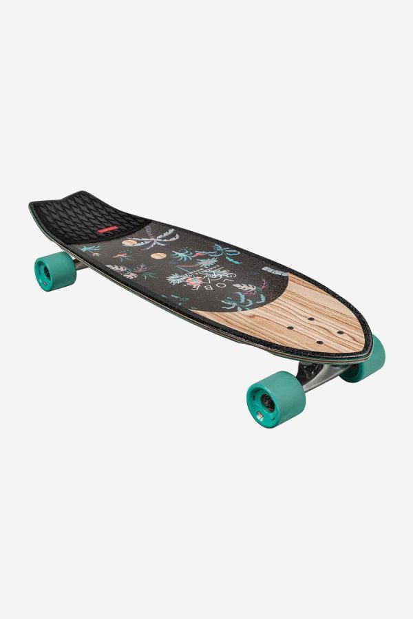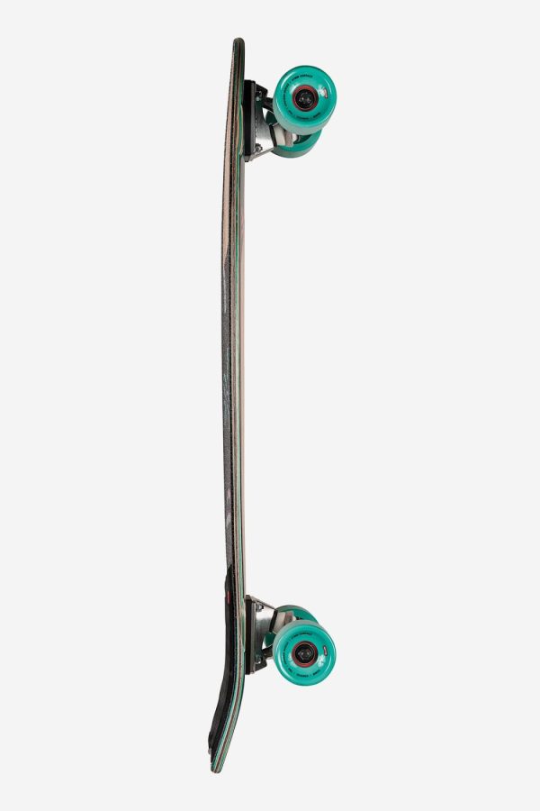 The Sun City in colour Olivewood/Neon Jungle comes in size 30″ x 9.0″ x 18.5″wb. Surf inspired swallow-tail cruiser. It is a Mellow concave with kicktail made of Olive wood + Resin-7 hard rock maple. It features 5.25″ Tensor alloy trucks and 62mm 78a wheels. Clear broadcast grip. EVA tailpad.